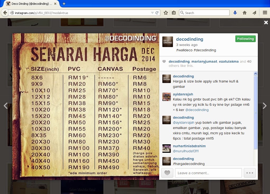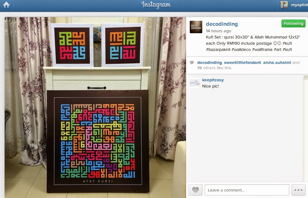 Trend sekarang nih, nak letak KUFI ART kt wall kan? X pun, gambar anak2 in canvas atau pvc type. So, elok sangat la kalau uols usha2 hasil kerja dorang nih kat IG Deco Dinding nih.