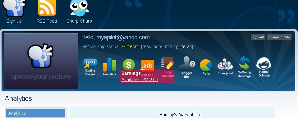Nampak? Nampak x? Mommy pn nak gak cari duit sampingan. Tapi, tgk la.. Ni br sgt la join Nuffnangs. Tu, dapat RM2. Xle mintak dgn dorg lg.. Isk.. Kena dpt rm50, br leh mntk. Kikiki.. Sedey..sedey.. Aku tgk, blogger lain, sampai tahap riban2 kot!! Xpe, usaha tangga kejayaan. Setiap dugaan itu adalah permulaan sebelum berjaya.. Ceeewaahhh! Kata2 semangat utk diri sendiri.