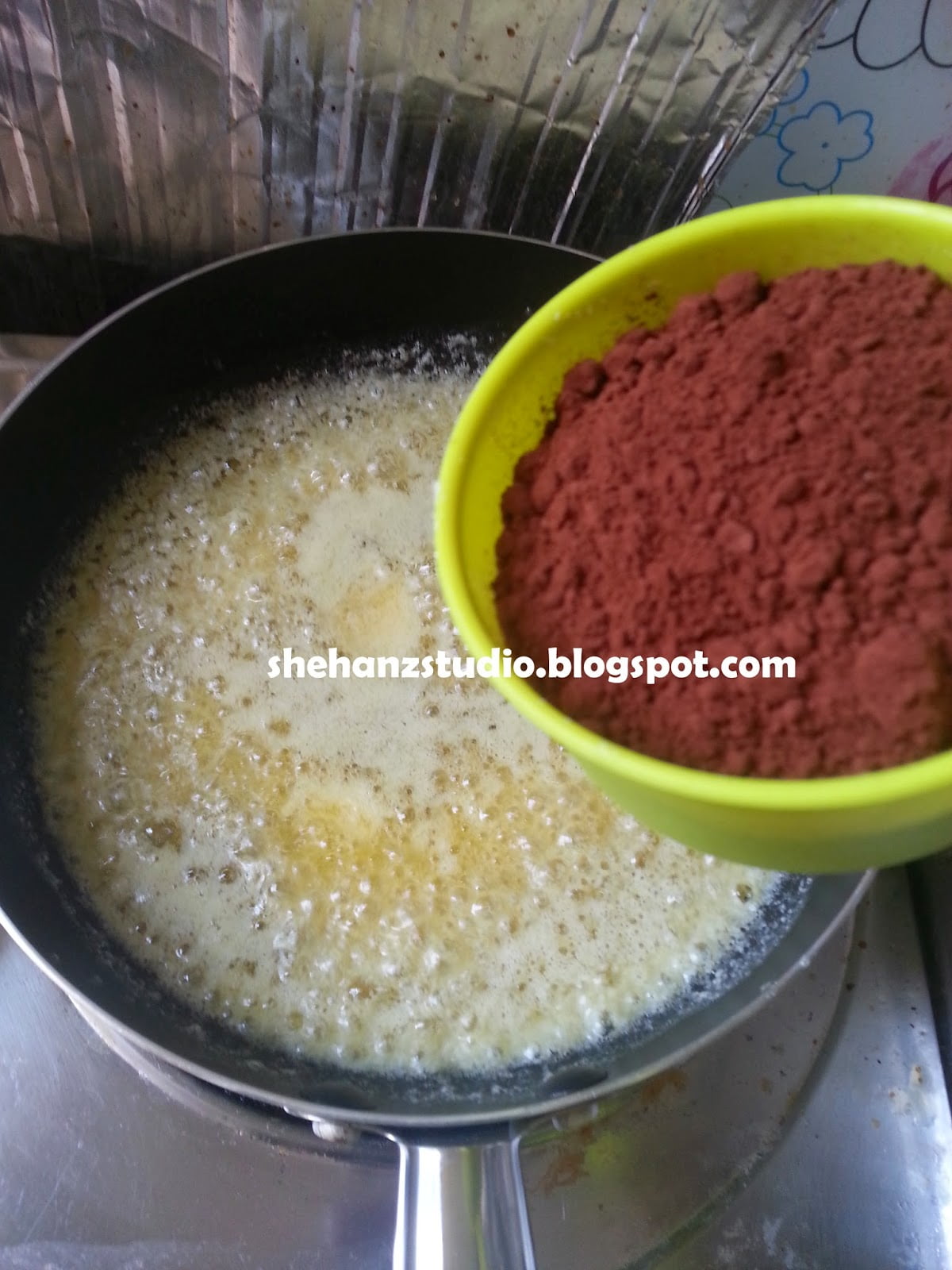 4) Setel butter & koko tadi, terus campur dalam adunan telur & gula tadi. Pukul lagi. (KALAU XDE MIXER, KACAU KAT MANGKUK BIASA PUN OK JER)