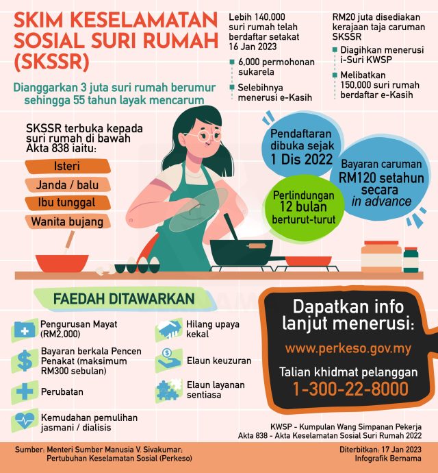 SKSSR | Suri Rumah terus dilindungi menerusi Skim Keselamatan Sosial Suri Rumah (SKSSR). Di bawah Belanjawan 2023, golongan suri rumah di Malaysia kini dapat membuat caruman sukarela dan memperoleh manfaat menerusi Skim Keselamatan Sosial Suri Rumah.