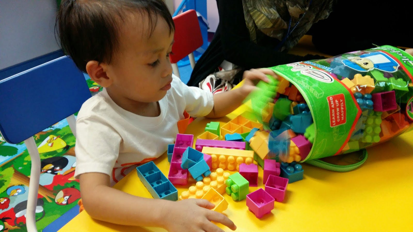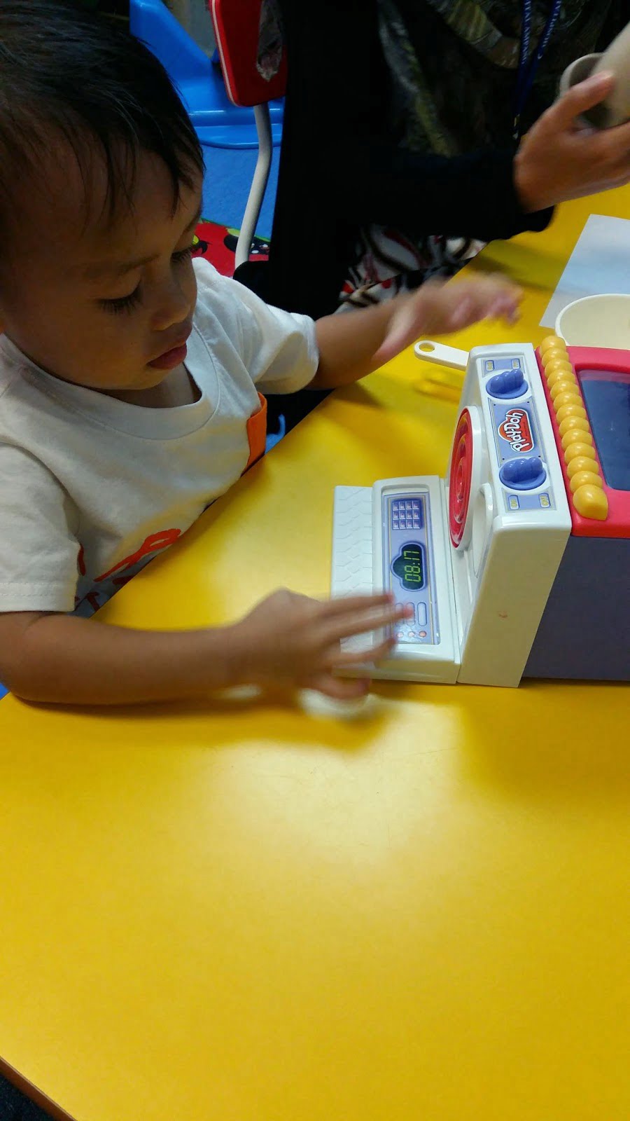 Therapist trace yang AE ada masalah dari segi behaviour. Bukan dia bad boy ke apa. Tapi lebih kepada TIDAK TAHU CARA BERMAIN. Barang2 yang dia suka main selalunya dia akan baling2. Mungkin dia ingat selama ni semua item itu cara mainnya seperti bola. Masa dia main aktiviti2 kat atas tu, setiap kali kita interrupt dia, dia akan samada baling item tu, atau amuk. Potong stim kot.
